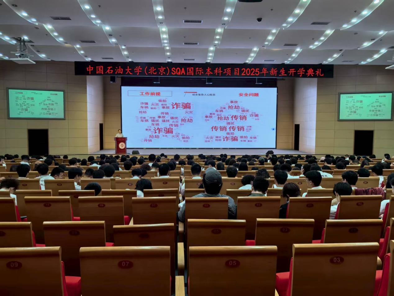 院长陈春茂为新生讲授“开学第一课”。他首先介绍了学校的光辉历程,强调中国石油大学(北京)“因油而生、因油而兴、因油而强”的办学特色,以及学校在学科建设、师资队伍和国际合作方面取得的成就。随后,他详细讲解了SQA项目的教学管理体系、学生支持服务以及丰富多彩的学生活动,鼓励同学们充分利用学校提供的国际化平台和资源。最后,陈院长寄语新生要牢记责任与担当,尽快培养良好的学习和生活习惯,努力成长为“面向世界、心怀祖国、德才兼备”的国际化人才,在未来的大学生活中不断超越自我,实现人生价值。